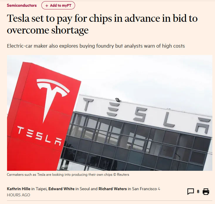 5月27日,据英国《金融时报》援引知情人士消息报道,特斯拉计划将提前付款购买芯片,并在考虑收购一家工厂,作为解决全球半导体短缺问题的部分措施。